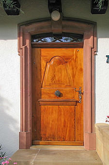 Diese Tür erhielt nicht nur eine überarbeitete Oberfläche, denn auch die Beschläge wurden nachjustiert und das überlieferte Kastenschloss mit einem Profilzylinder versehen. Durch eine durchgehende Aufdoppelung nach Innen konnte eine klimatechnische Aufwertung erzielt werden. Schließlich konnte die vorgefundene Gliederung mit den Profilen übertragen werden.